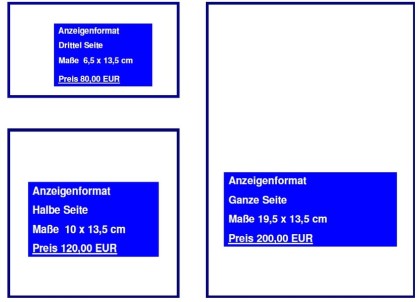 Anzeige Drittel Seite im Innenteil ( 6,5x13,5 cm) Preis 80 EUR zuzüglich Mwst.